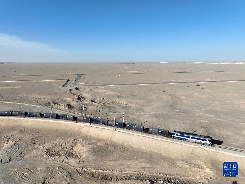 11月21日,首趟“敦煌號”(敦煌-天津港-泰國)鐵海聯(lián)運國際貨運班列駛出敦煌鐵路西貨站綜合貨場(chǎng)(無(wú)人機照片)。