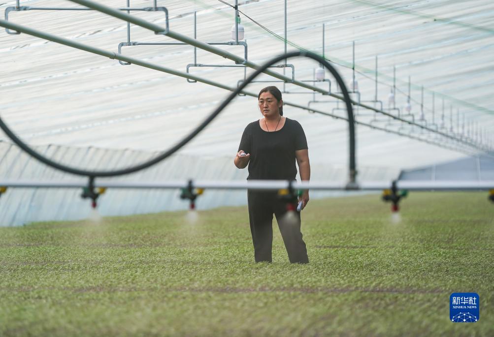 饒陽(yáng)縣大尹村鎮南北巖村眾瑞合作社社長(cháng)楊姍姍在新建的全鋼架無(wú)立柱新型日光溫室里遙控操作自動(dòng)噴淋裝置給西紅柿幼苗澆水(11月20日攝)。