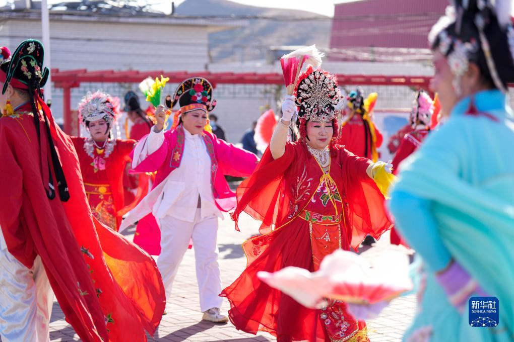 河北省灤州市葛莊村地秧歌隊隊員在村廣場(chǎng)上表演(11月17日攝)。