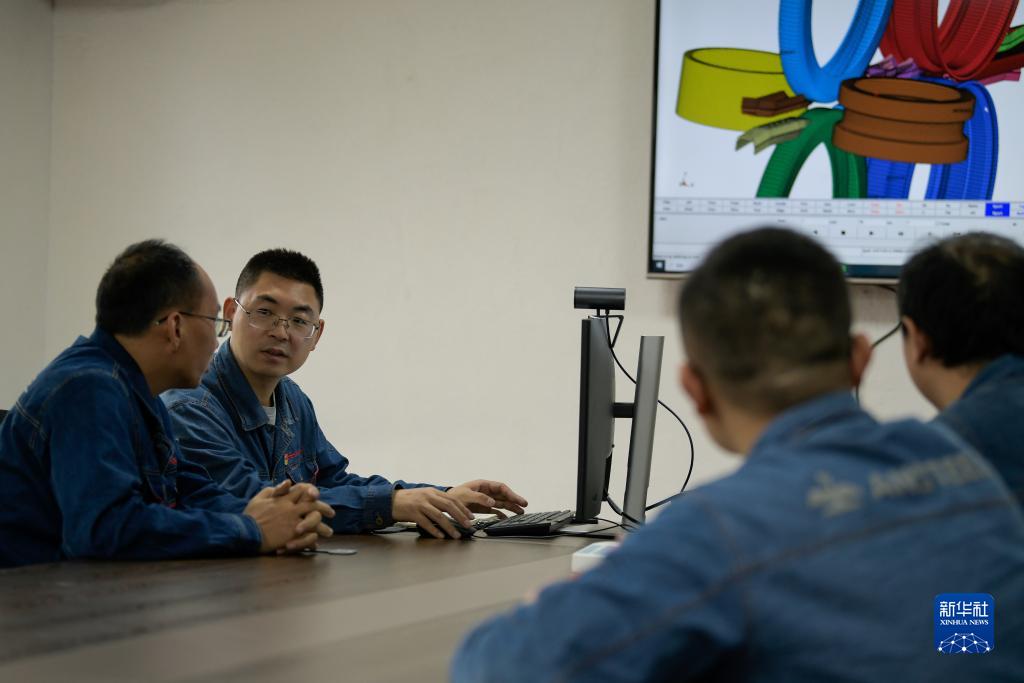 11月21日,在攀鋼釩軌梁廠(chǎng),呂攀峰(左二)與團隊成員利用仿真軟件對新產(chǎn)品設計情況進(jìn)行分析。