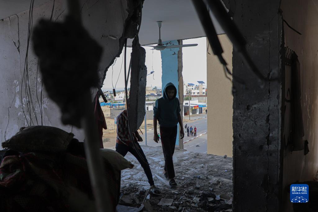 11月22日,在加沙地帶南部城市汗尤尼斯,巴勒斯坦人查看遭以色列襲擊后的建筑廢墟。