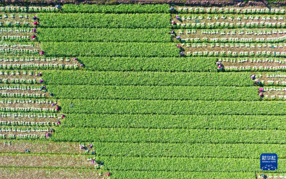 11月22日,在浙江省溫嶺市石橋頭鎮蔬菜基地,農民在采收高腳白菜(無(wú)人機照片)。