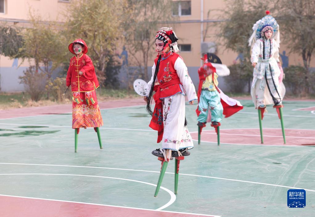 11月22日,河北省霸州市勝芳鎮紅光小學(xué)的學(xué)生在排練高蹺。