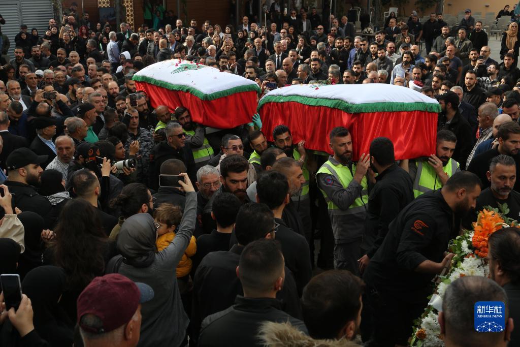 11月22日,在黎巴嫩貝魯特,人們?yōu)閮擅谝攒娨u擊中喪生的記者舉行葬禮。