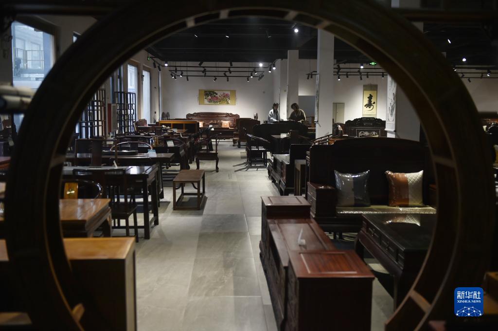 11月22日在滑縣半坡店古典家具特色小鎮拍攝的一家企業(yè)的家具展廳。