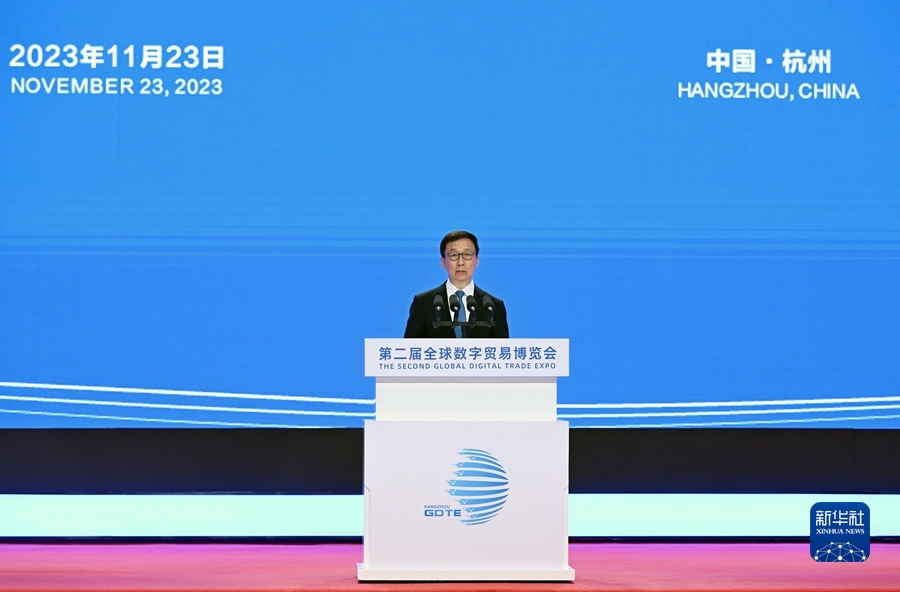 11月23日,國家副主席韓正在浙江杭州出席第二屆全球數字貿易博覽會(huì )開(kāi)幕式,宣讀習近平主席賀信并致辭。
