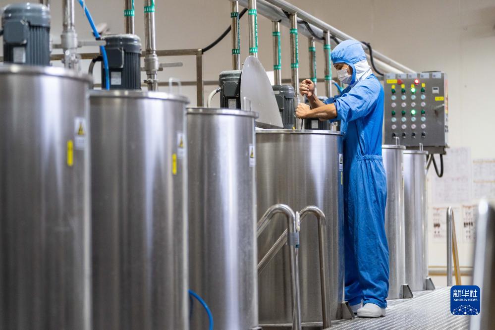 11月23日,在鹽津鋪子瀏陽(yáng)生產(chǎn)基地,工人在攪拌食品原料。