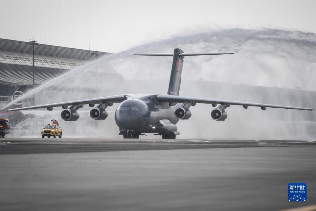 11月23日,在沈陽(yáng)桃仙國際機場(chǎng),運送志愿軍烈士遺骸的空軍專(zhuān)機通過(guò)水門(mén)。