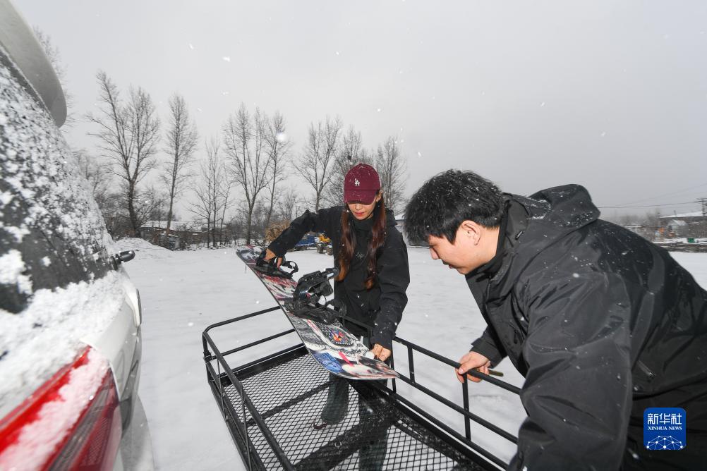 11月23日,在吉林省吉林市永吉縣北大湖鎮南溝村,王雪(左)幫自家民宿住宿的住客搬運雪板。