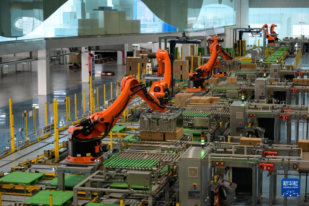 11月23日,在呼和浩特市伊利現代智慧健康谷液態(tài)奶全球智造標桿基地,機器人在碼放裝箱的乳制品。