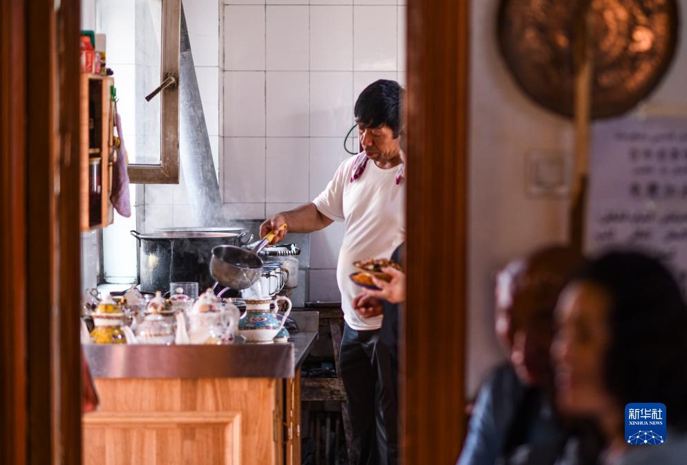 新疆喀什古城百年老茶館內,工作人員往茶壺里加水(9月16日攝)。