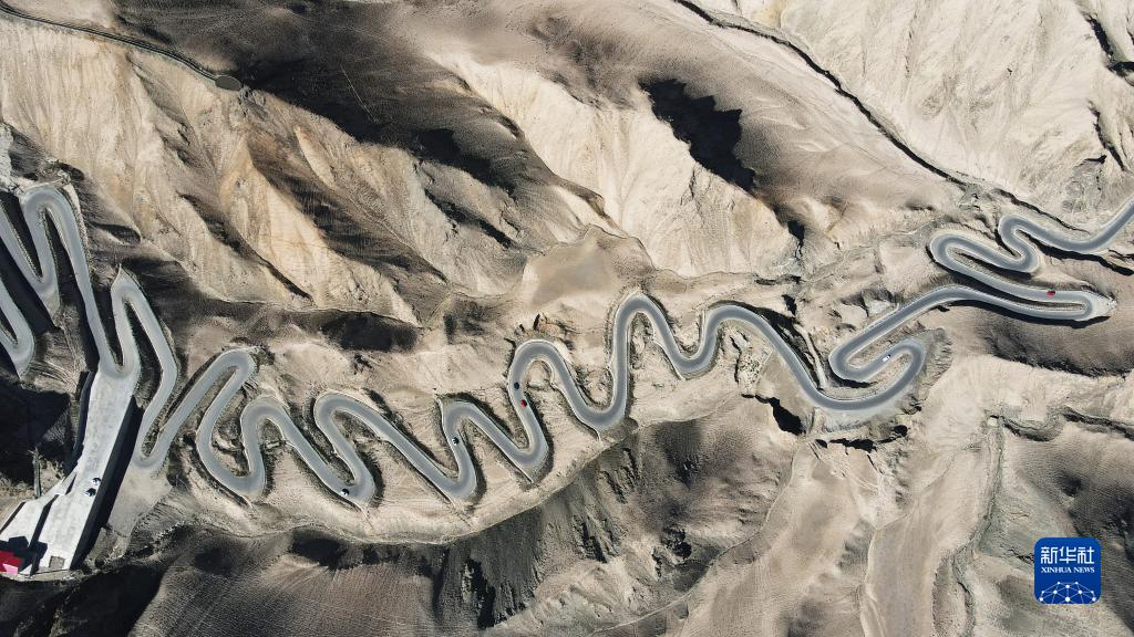 游客駕車(chē)穿行在新疆塔什庫爾干塔吉克自治縣“盤(pán)龍古道”景區(9月5日攝,無(wú)人機照片)。