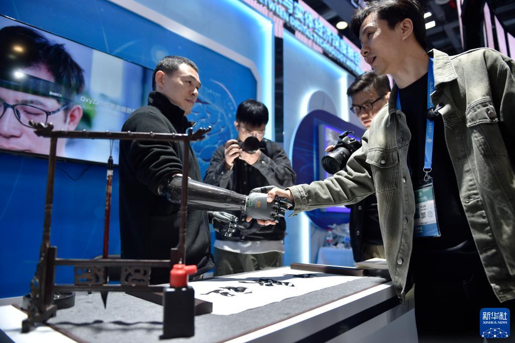 11月23日,在第二屆全球數字貿易博覽會(huì )上,觀(guān)眾在前沿趨勢館體驗與穿戴智能仿生手的參展人員握手。
