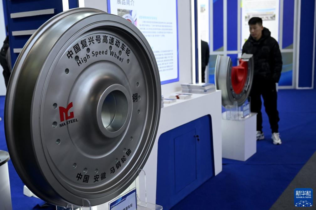 這是11月24日在第三屆國際新材料產(chǎn)業(yè)大會(huì )展覽上拍攝的中國復興號高速動(dòng)車(chē)輪模型。