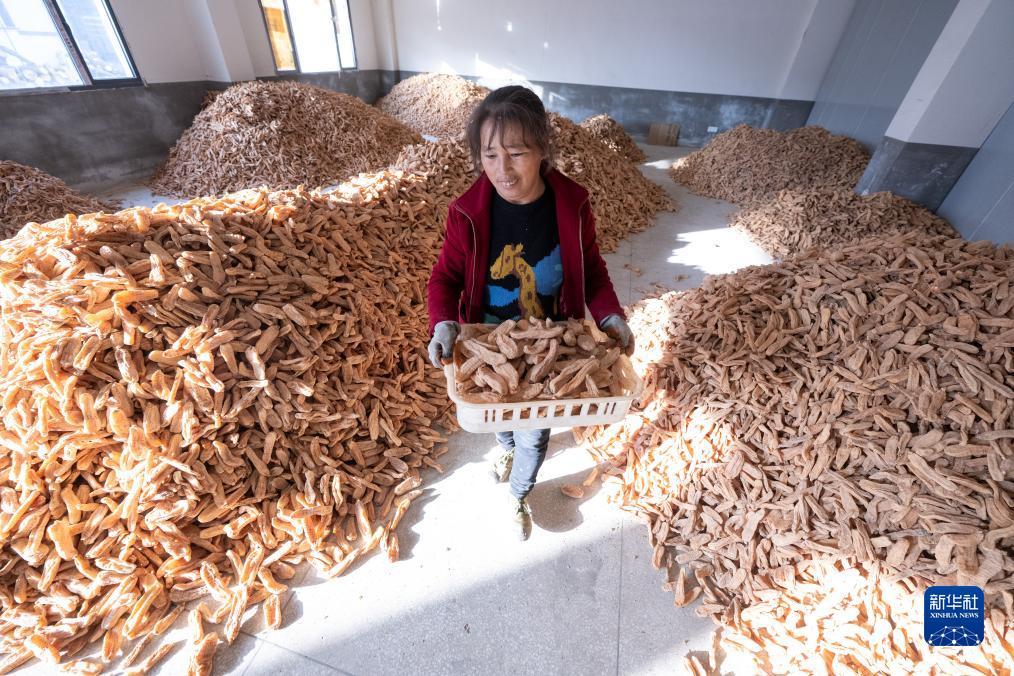 11月23日,在湖北省羅田縣九資河鎮葫蘆石村,藥農在整理晾曬的天麻。
