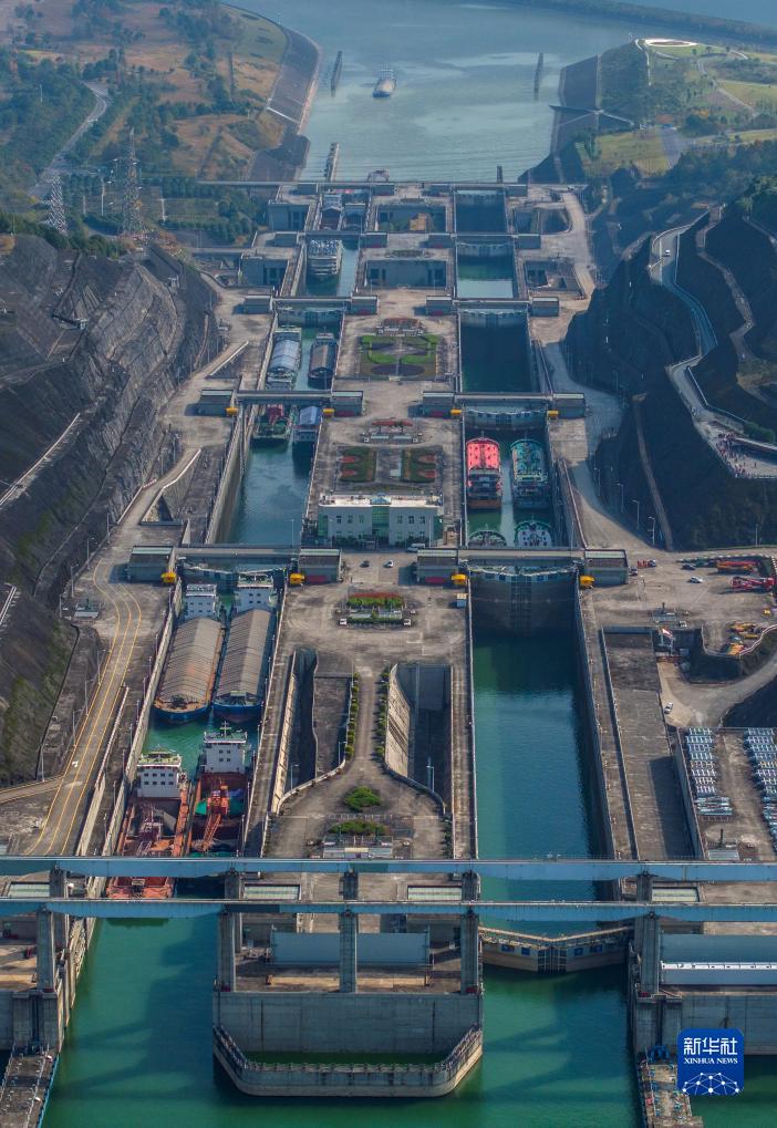 11月24日,在湖北省宜昌市,船舶有序通過(guò)三峽雙線(xiàn)五級船閘(無(wú)人機照片)。