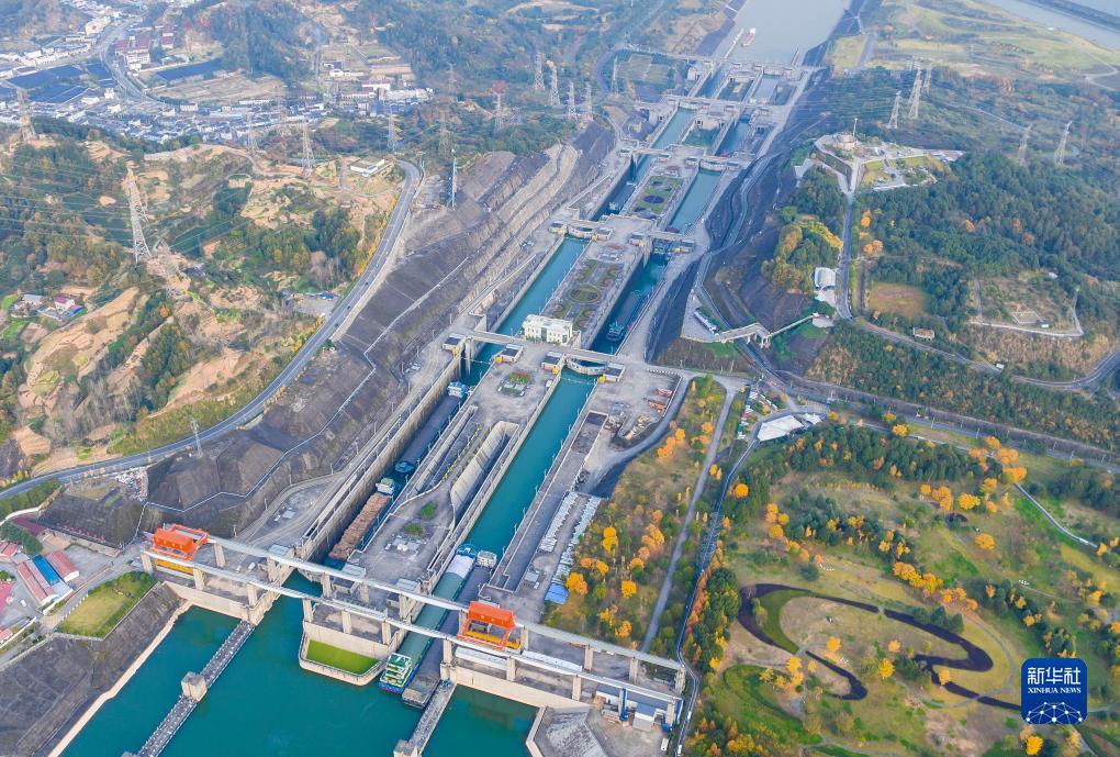 11月24日,船舶有序通過(guò)三峽雙線(xiàn)五級船閘(無(wú)人機照片)。