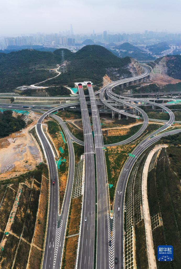 11月24日,車(chē)輛在貴金高速公路竇官樞紐互通上行駛(無(wú)人機照片)。