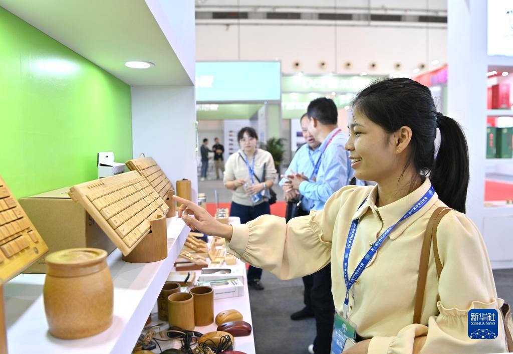 11月24日,觀(guān)眾在南寧國際會(huì )展中心觀(guān)看一款竹制鍵盤(pán)。