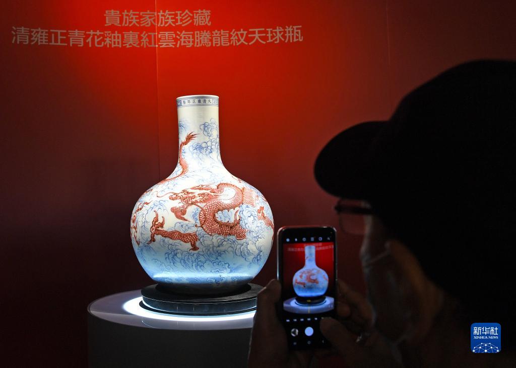 11月24日,在香港會(huì )議展覽中心,觀(guān)眾拍攝清雍正青花釉里紅云海騰龍紋天球瓶。