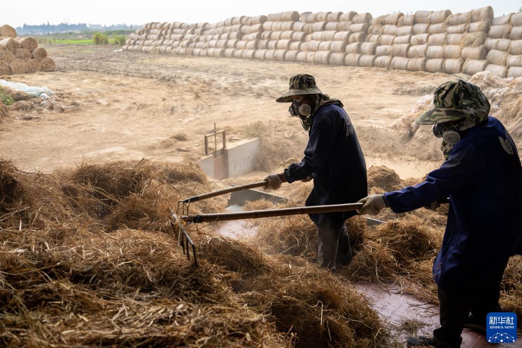 近日,在湖南省益陽(yáng)市南縣武圣宮鎮沿河堤村的稻草飼料化項目現場(chǎng),工人們忙著(zhù)將成捆秸稈進(jìn)行打散篩選,送入飼料化生產(chǎn)線(xiàn)。秸稈經(jīng)過(guò)切碎、震蕩過(guò)篩、風(fēng)選除塵、壓縮打包等工序后,即可成為牛羊飼草。據悉,該基地每年秸稈離田收儲能力可達1萬(wàn)噸、年飼料化加工能力8000噸,每噸毛利潤約400元。