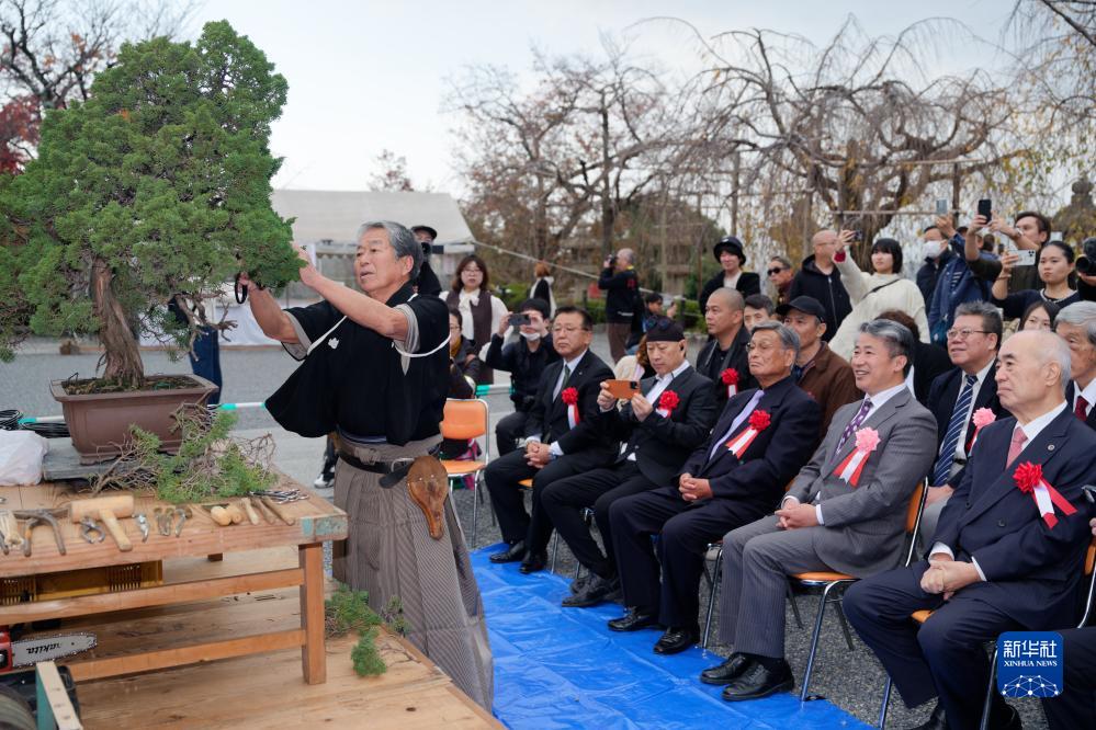 11月24日,在日本京都清水寺舉行的中日盆栽水石展開(kāi)幕式上,日本春花園BONSAI美術(shù)館創(chuàng )始人、盆栽大師小林國雄(左一)表演盆栽作品創(chuàng )作過(guò)程。