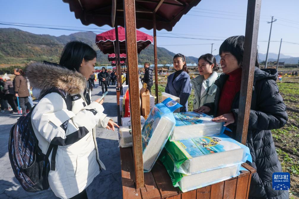 11月25日,在杭州市臨安區郎家村,游客在稻田文化節上選購大米。