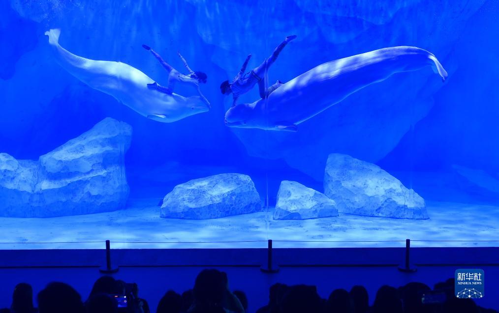 在位于河南省中牟縣的鄭州海昌海洋公園極地動(dòng)物館內,工作人員和白鯨在音樂(lè )的伴奏下,為游客帶來(lái)精彩的水下表演。