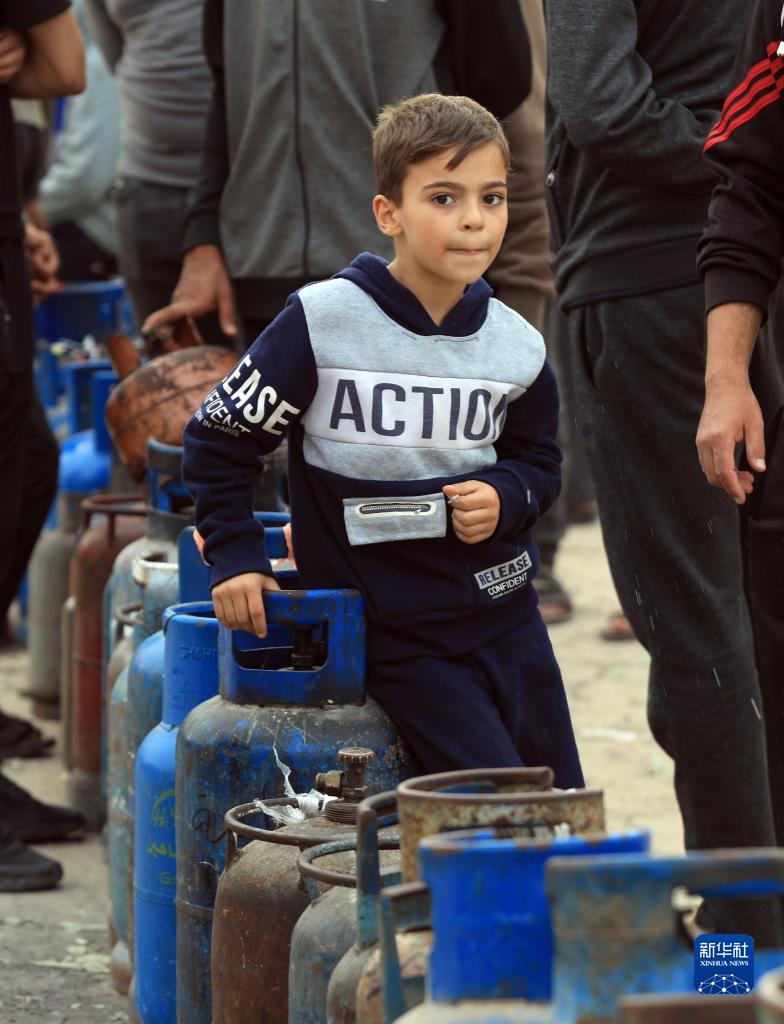 11月25日,在加沙地帶南部城市汗尤尼斯,人們排隊等待為天然氣罐充氣。