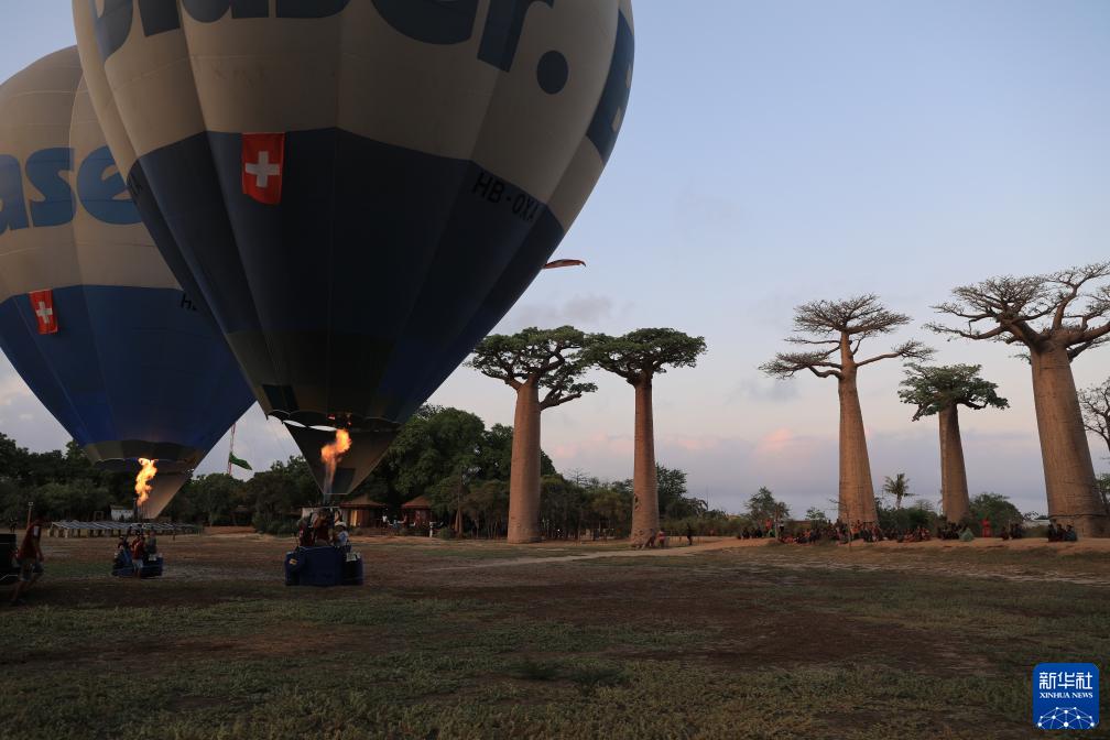 當日,在馬達加斯加穆龍達瓦猴面包樹(shù)大道,來(lái)自瑞士、法國等國的熱氣球旅行愛(ài)好者于日出時(shí)分乘坐熱氣球升空。猴面包樹(shù)與熱氣球構成了一道獨特的風(fēng)景。