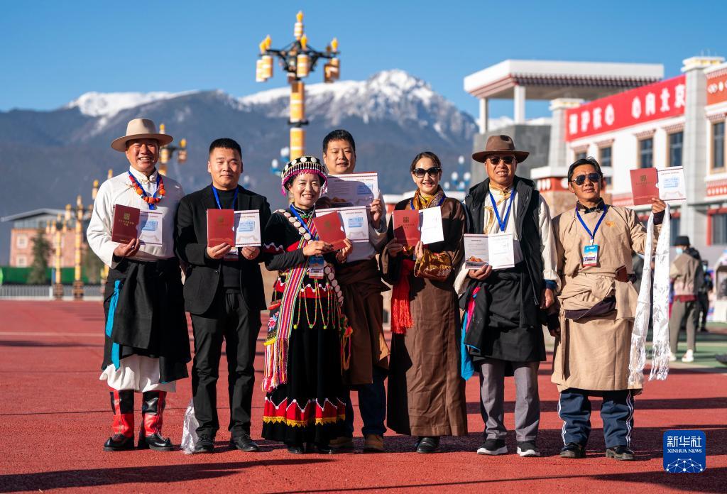 11月26日,參加麗香鐵路開(kāi)通儀式的嘉賓在香格里拉站站前廣場(chǎng)手持紀念車(chē)票合影。