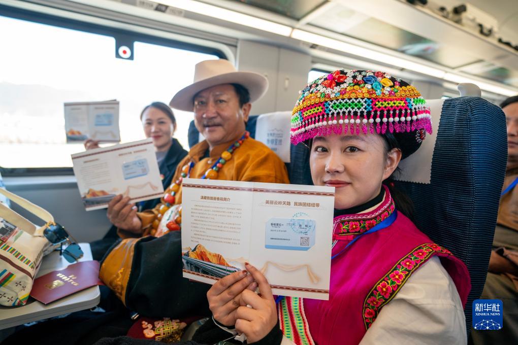11月26日,乘坐麗香鐵路開(kāi)通首發(fā)列車(chē)的嘉賓在車(chē)廂內展示紀念車(chē)票。