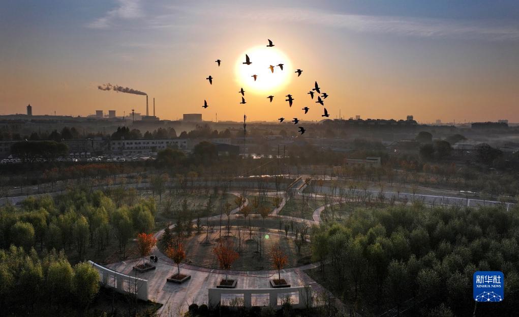 11月26日,一群鴿子在唐山市古冶區石榴河濕地公園上空飛舞(無(wú)人機照片)。