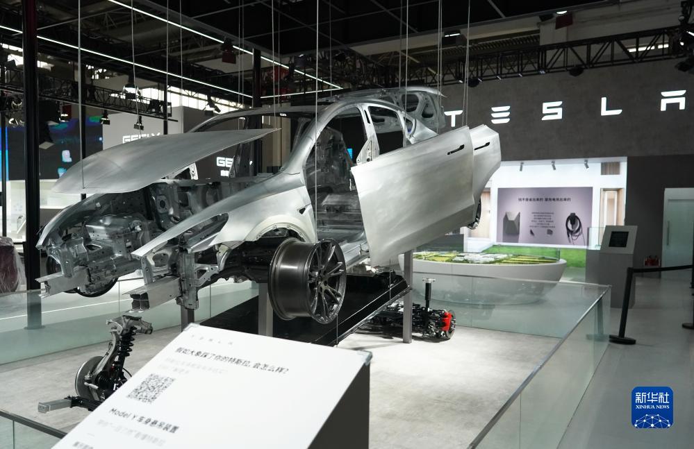 11月26日在中國國際供應鏈促進(jìn)博覽會(huì )智能汽車(chē)鏈展區拍攝的特斯拉展位。