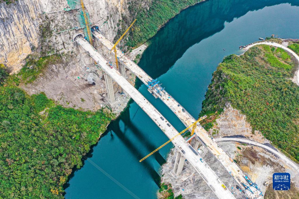這是11月26日拍攝的位于重慶市酉陽(yáng)土家族苗族自治縣龔灘鎮的阿蓬江大橋施工建設現場(chǎng)(無(wú)人機照片)。