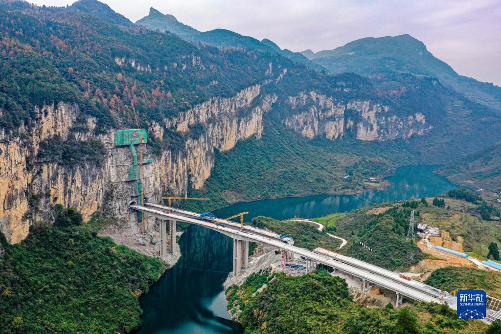 這是11月26日拍攝的位于重慶市酉陽(yáng)土家族苗族自治縣龔灘鎮境內的阿蓬江大橋施工建設現場(chǎng)(無(wú)人機照片)。