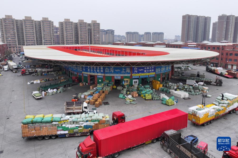 11月26日,在白溝新城東物流園區,貨車(chē)在裝卸貨物(無(wú)人機照片)。
