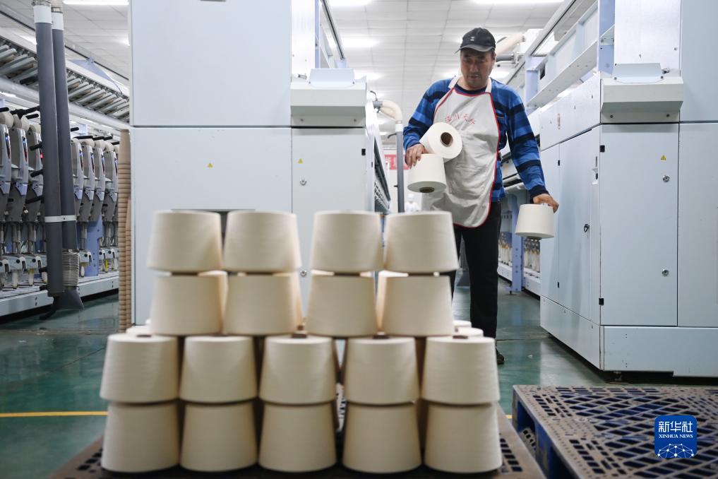 11月26日,在涇川縣一家棉紗生產(chǎn)企業(yè),工人搬運生產(chǎn)的棉紗。