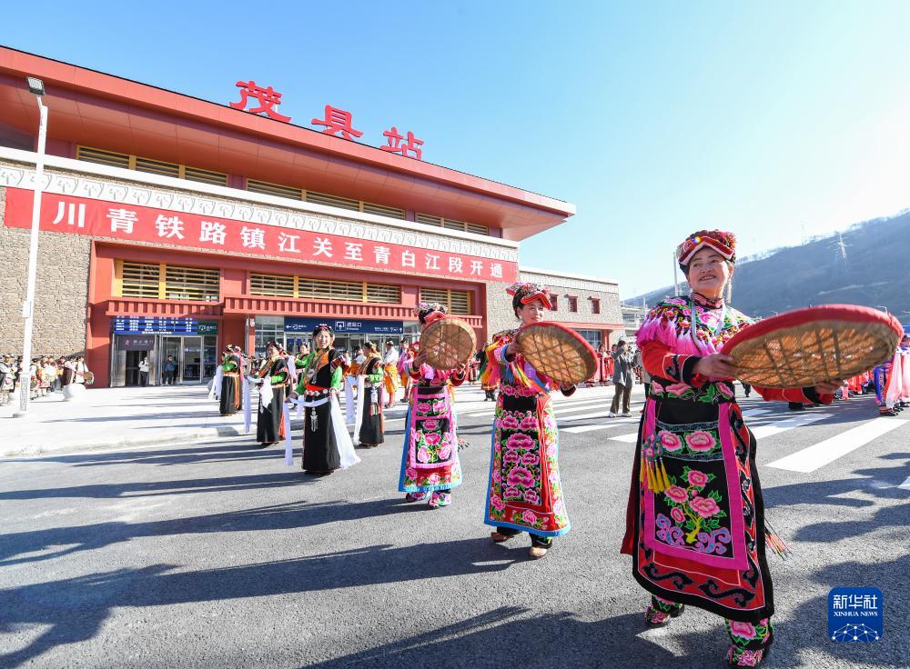 11月28日,在川青鐵路茂縣站,當地各族群眾在站前廣場(chǎng)慶祝鐵路開(kāi)通運營(yíng)。