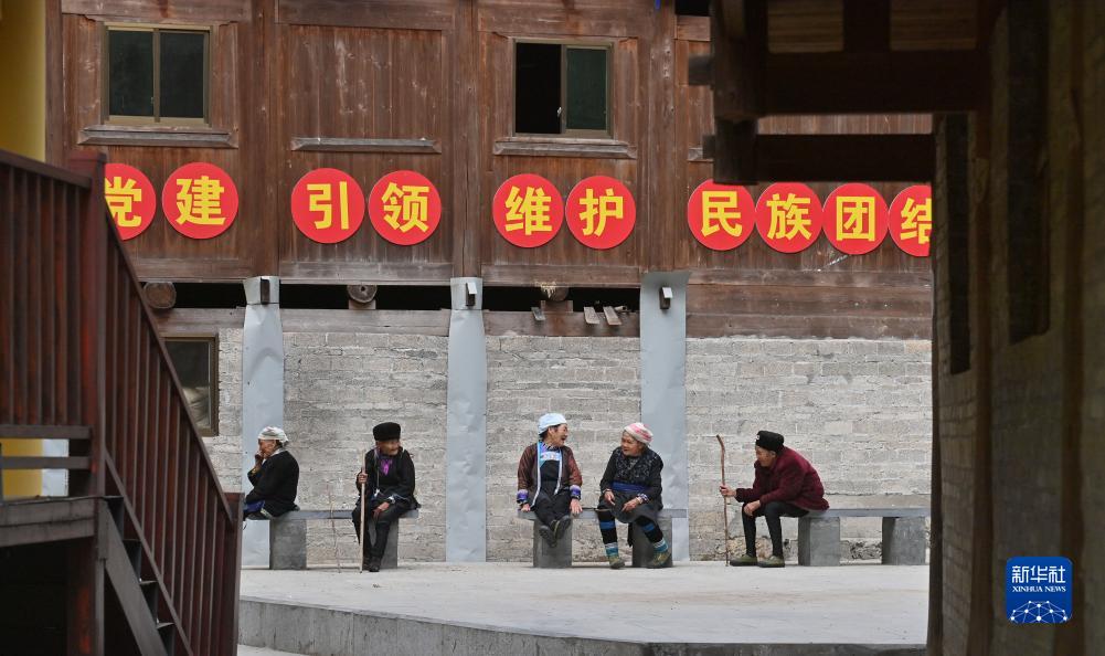 在烏英苗寨,老人們在窗外的小廣場(chǎng)上曬太陽(yáng)(2023年3月15日攝)。