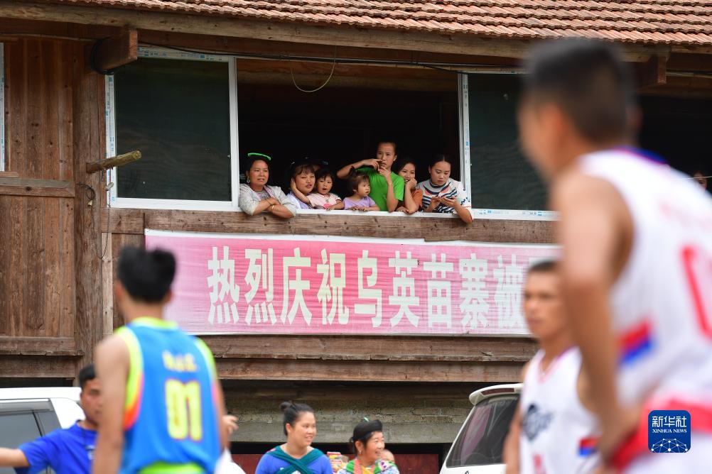 烏英苗寨村民在木樓里觀(guān)看窗外的籃球比賽(2019年7月19日攝)。