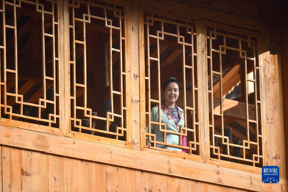 一名烏英苗寨村民從風(fēng)雨樓里看窗外的風(fēng)景(2023年10月4日攝)。