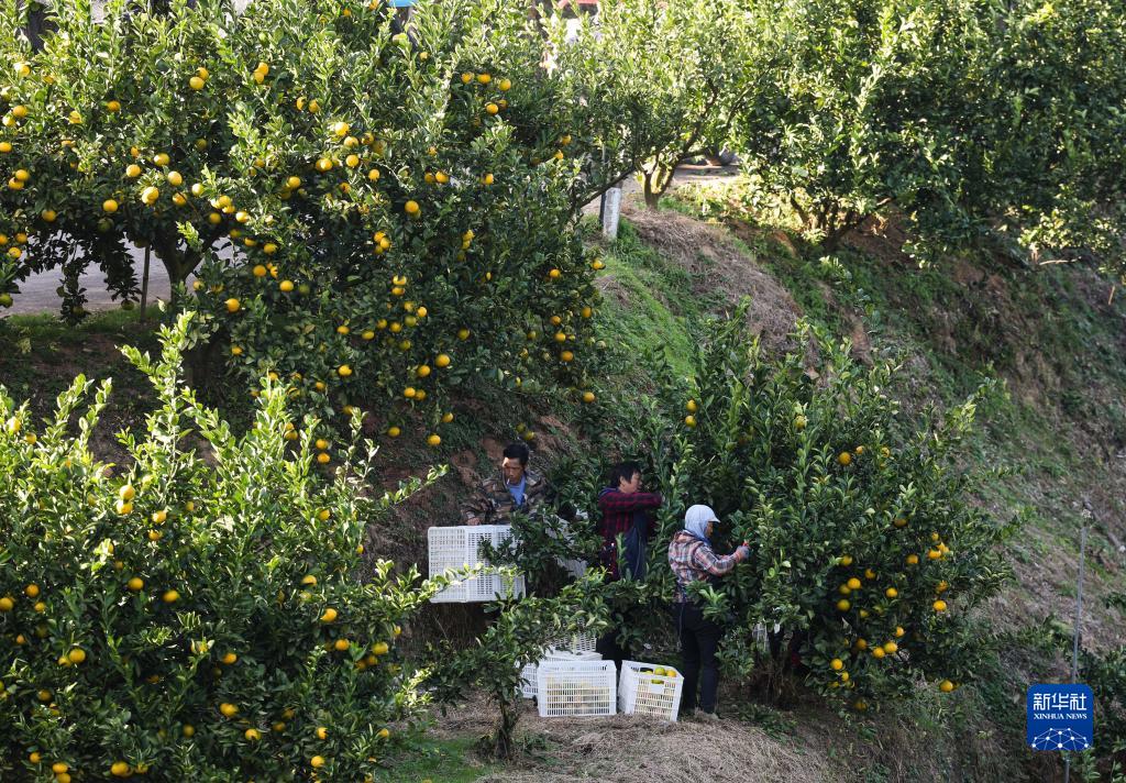 11月28日,在位于浙江省麗水市慶元縣黃壇村的外婆家水果專(zhuān)業(yè)合作社甜桔柚基地內,果農在采摘成熟的甜桔柚。