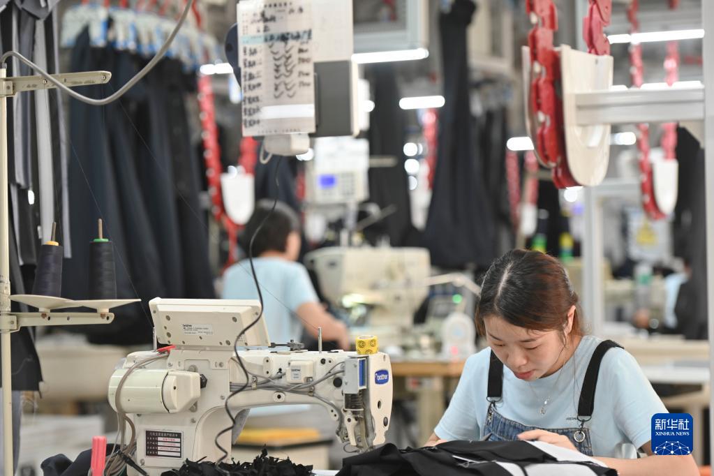 在位于福建省泉州市經(jīng)濟技術(shù)開(kāi)發(fā)區的九牧王西褲智能化生產(chǎn)車(chē)間,工人在自動(dòng)化西褲吊掛流水線(xiàn)上作業(yè)(7月30日攝)。新華社記者 宋為偉 攝
