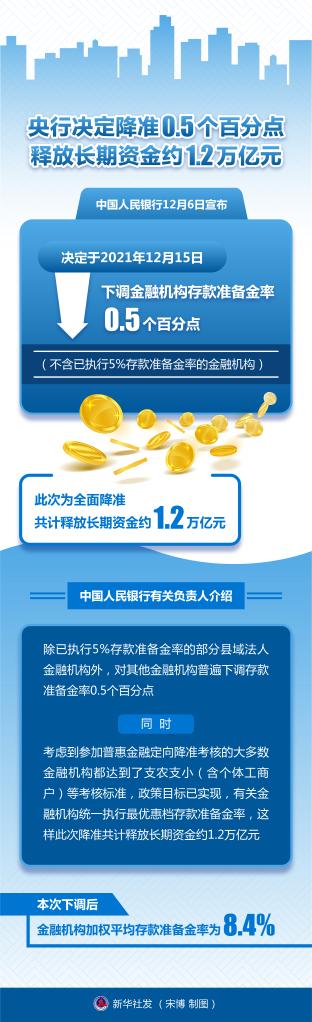 中國人民銀行12月6日宣布,決定于2021年12月15日下調金融機構存款準備金率0.5個(gè)百分點(diǎn)(不含已執行5%存款準備金率的金融機構)。此次為全面降準,共計釋放長(cháng)期資金約1.2萬(wàn)億元。新華社發(fā) 宋博 制圖