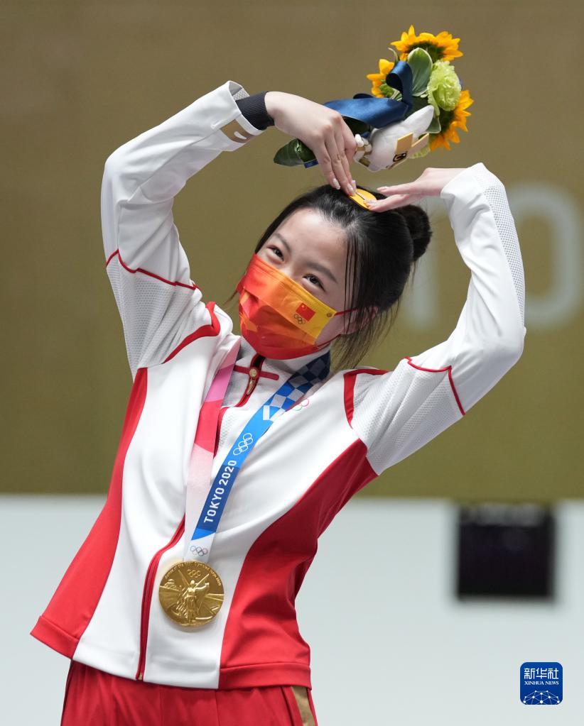 7月24日,楊倩在東京奧運會(huì )射擊女子10米氣步槍頒獎儀式上“比心”。新華社記者 鞠煥宗 攝