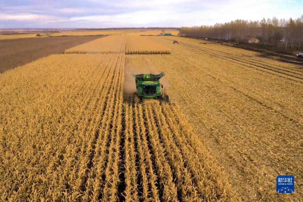 這是10月7日拍攝的黑龍江省綏化市北林區玉米收割現場(chǎng)(無(wú)人機照片)。新華社發(fā)(楊明輝 攝)