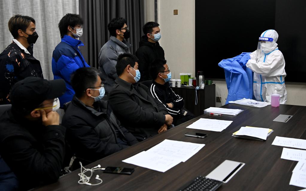 2021年12月24日,在西安外國語(yǔ)大學(xué),醫務(wù)人員為即將前往隔離酒店送考上門(mén)的師生講解防護服穿脫的注意事項。新華社記者劉瀟 攝