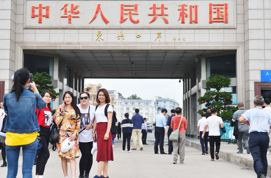 ↑這是往日繁華熱鬧的東興市,游客在東興口岸的國門(mén)前合影拍照(2019年3月21日攝)。