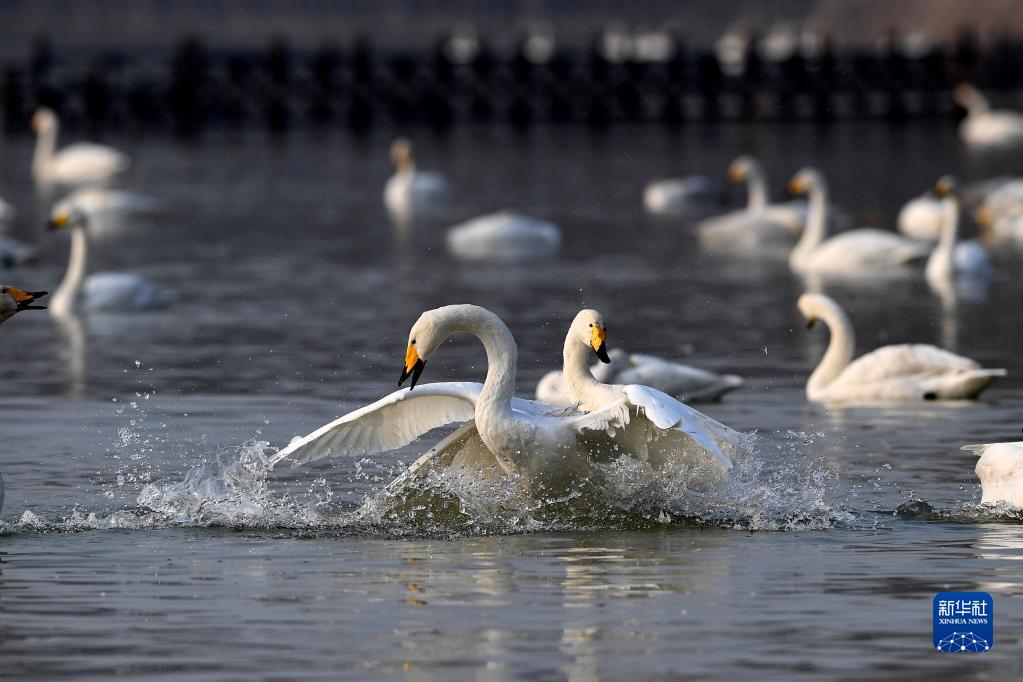 冬日暖陽(yáng)下,山西芮城縣圣天湖濕地、平陸縣三灣濕地的湖面上,數以萬(wàn)計的野生大天鵝隨波嬉戲,歡叫聲此起彼伏。